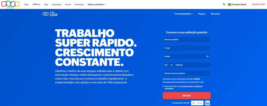 | Zoho | Sim | R$45 | 1 | Reais | Diversas | CRM/ Leads |